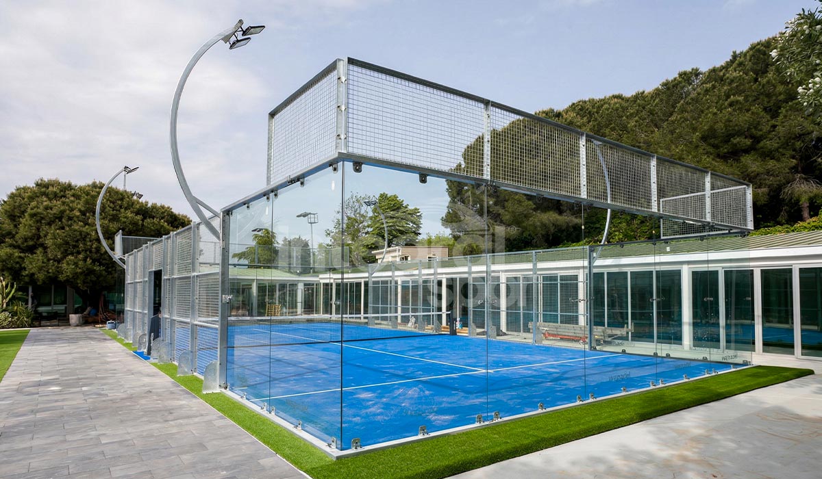 Grâce à la conception en verre panoramique à 360°, une visibilité ininterrompue est assurée sur le terrain, tandis que les panneaux en verre trempé et la structure en acier galvanisé garantissent durabilité et longévité. Le gazon professionnel de padel utilisé sur la surface offre un rebond optimal de la balle et un grand confort de jeu, permettant une utilisation toute l’année.